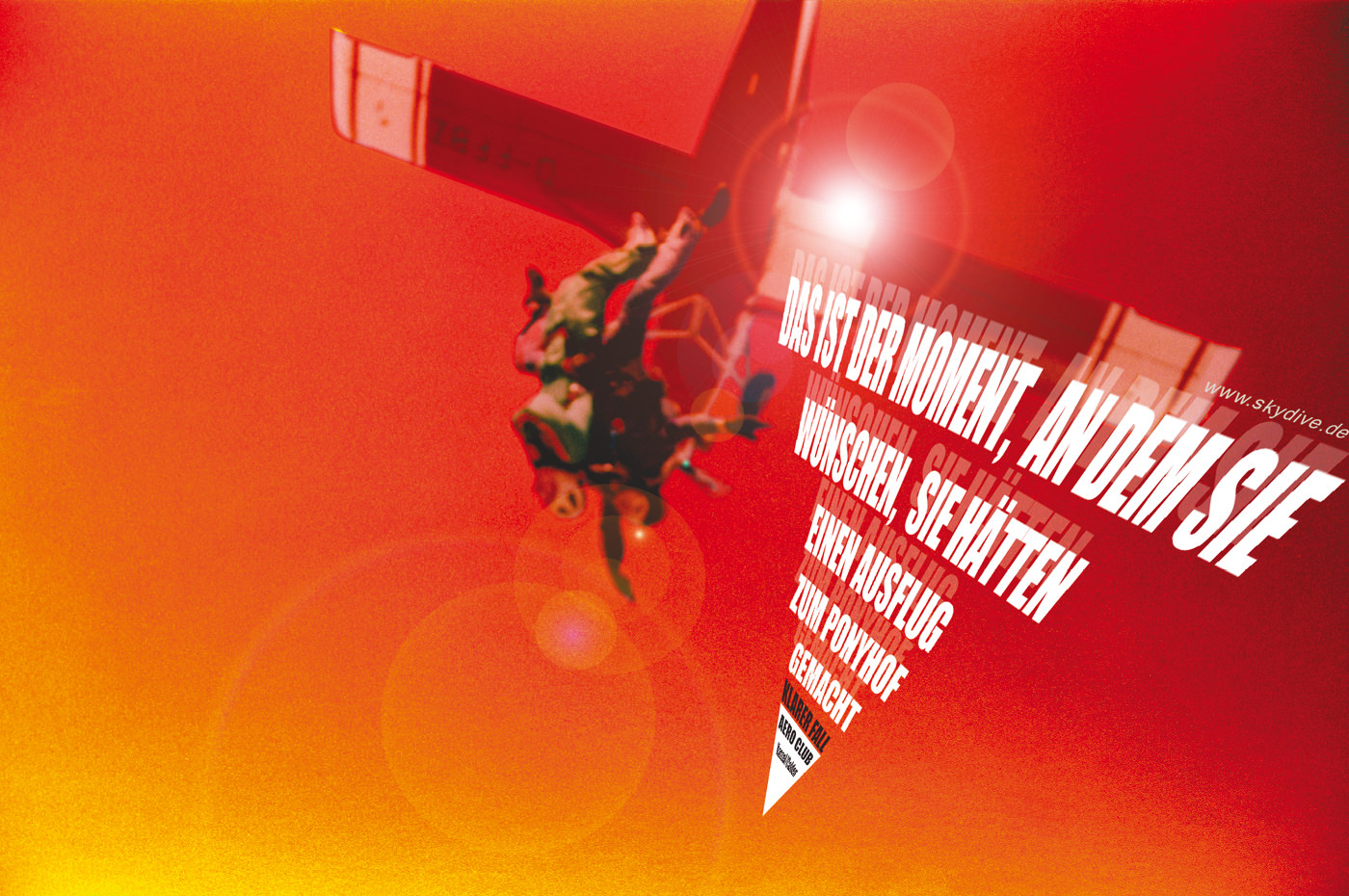 Die Königsdisziplin, wenn es um Nervenkitzel geht: Tür auf. Rausschauen. Feststellen, dass es 4000 Meter nach unten geht. Springen. Man sagt auch Fallschirmspringen oder Tandemspringen dazu. Deutschlands Sprungschule Nummer 1 macht es möglich. Der emotionale Zustand während des freien Falls ist das beste Argument dafür (oder dagegen). Je nachdem, mit welchem Nervenkostüm man ausgestattet ist. Und? Auch mal probieren? I Konzept, Art Direction, Creative Direction