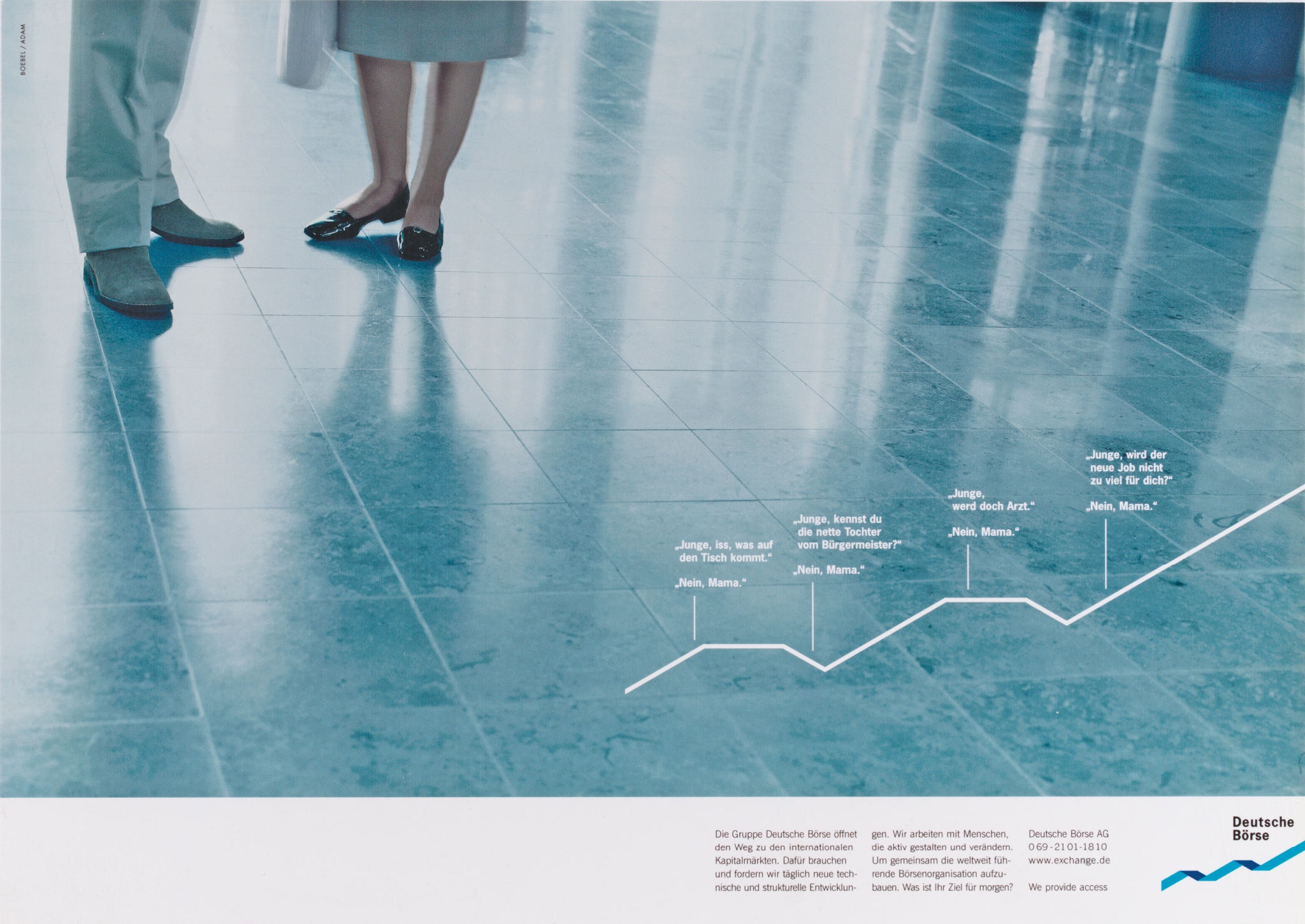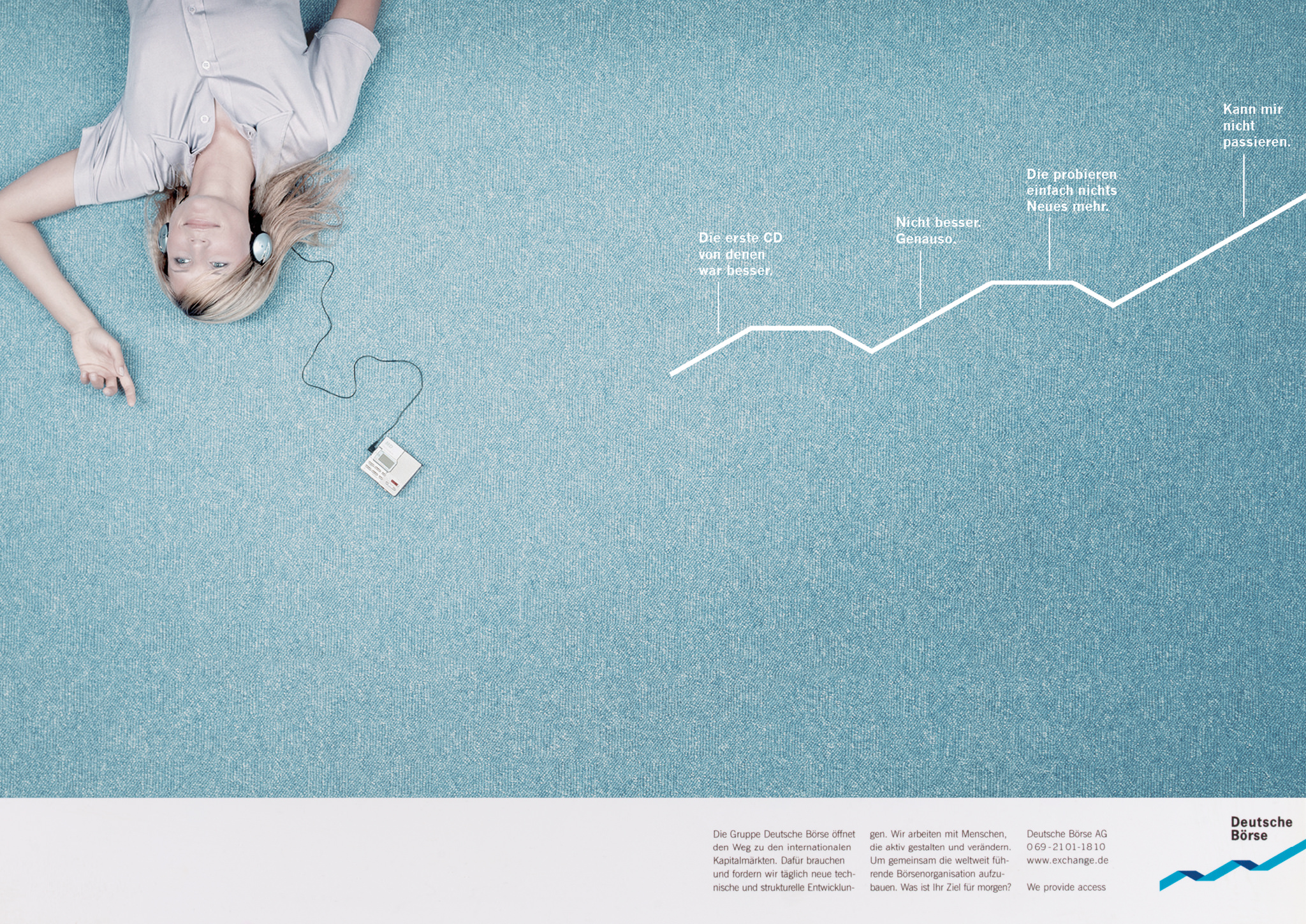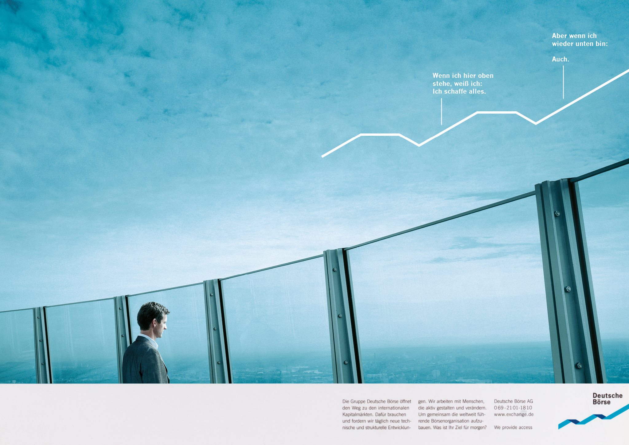 Als Recruiting Kampagne gedacht, leisteten die Motive weit mehr und wurden zur Imagekampagne der Deutschen Börse. Eine Kurve, die aus dem Logo der Deutschen Börse abgeleitet ist, wird zum Auf-und-Ab für kleine Geschichten, Momentaufnahmen und Gedanken aus dem Leben mit und um die Deutsche Börse als Arbeitgeber. Großzügige Bildaufteilung, stark angeschnittene Protagonisten und Unschärfen betonen Freiheit und Dynamik des Handelns und Denkens im Umfeld der Deutschen Börse. Der Fokus wird dabei auf das gelenkt, worauf es ankommt: Auf die Nähe zu den Mitarbeitern und potentiellen Bewerbern. I Konzept, Art Direction, Shooting