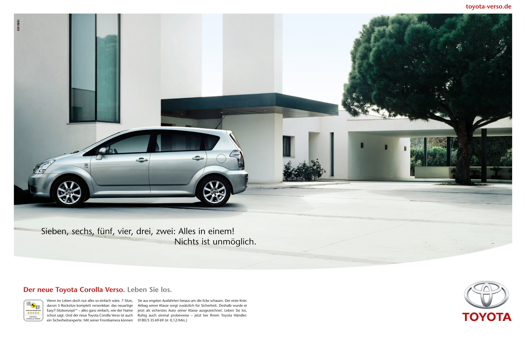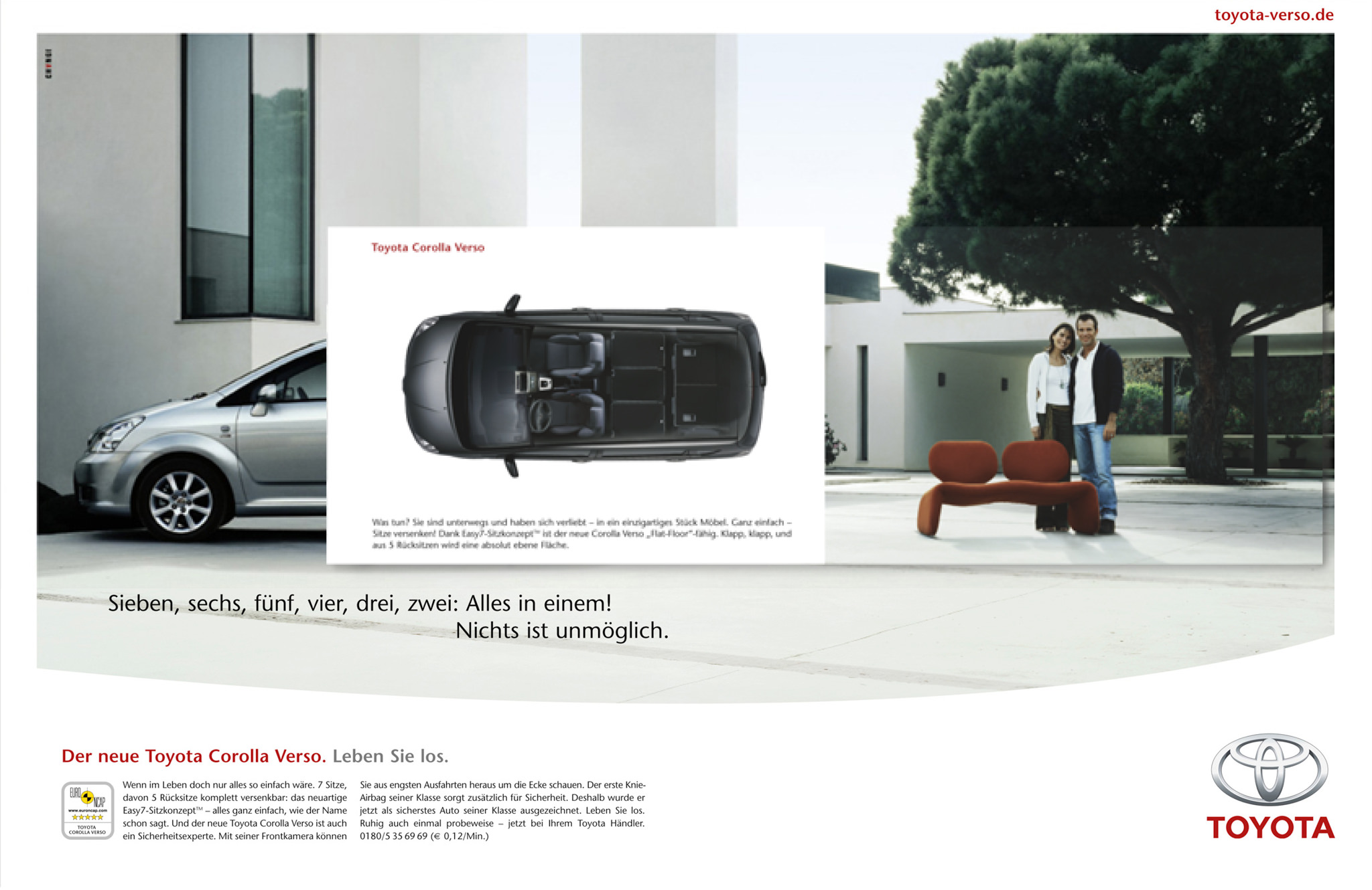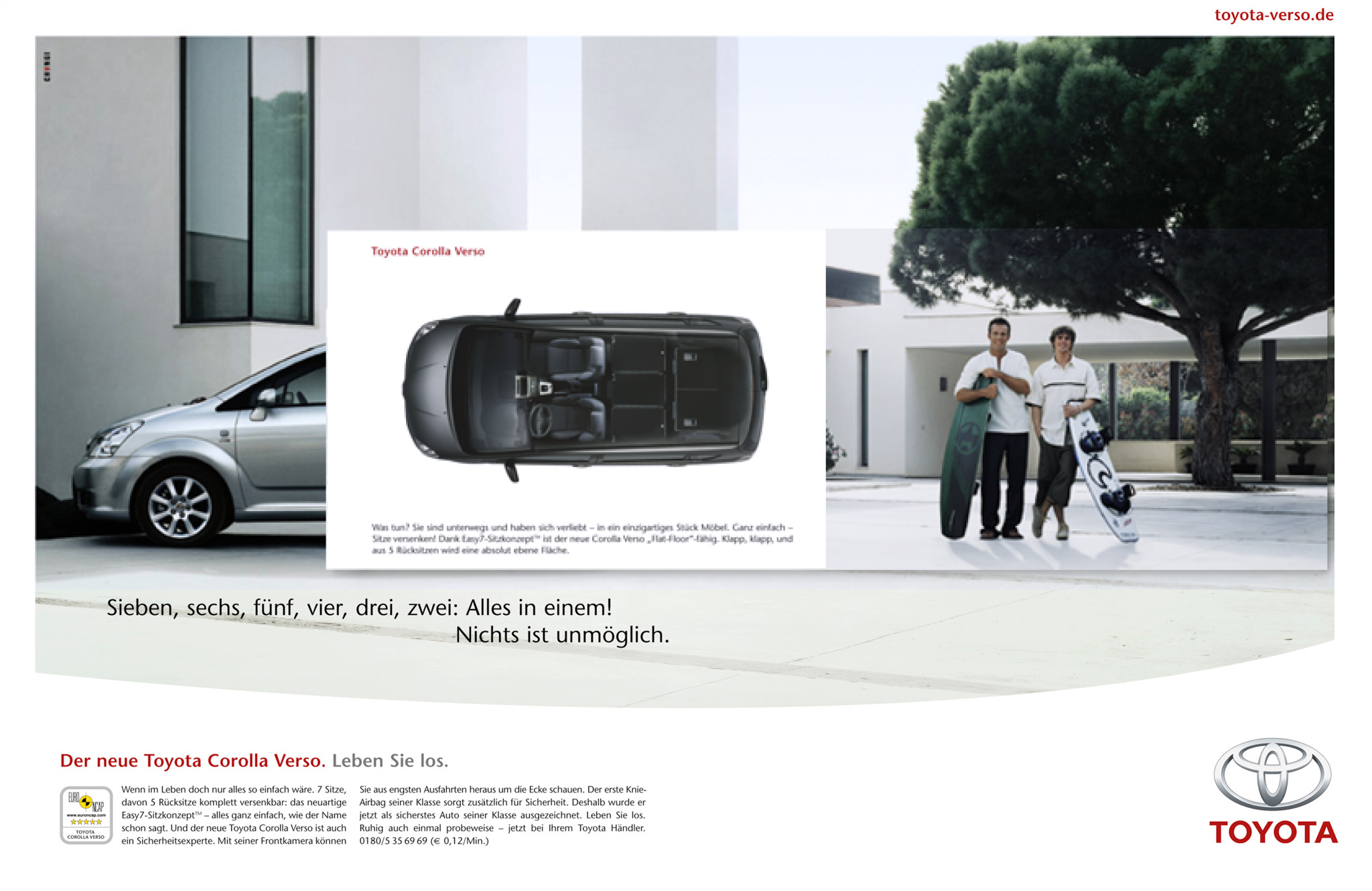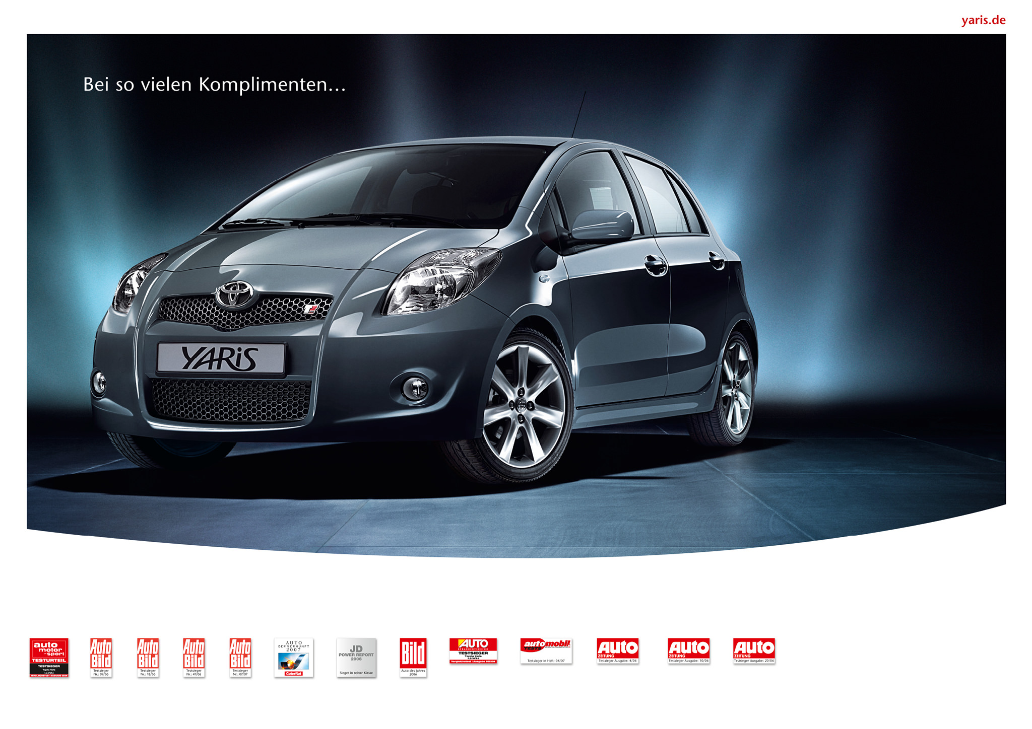 Eine Auswahl an Arbeiten für Toyota: Filmidee für Toyota Auris: „Stuntman“. Konzept, Art Direction und Shooting für Toyota Land Cruiser Kampagne. Art Direction und Shooting für Toyota Corolla Verso. Konzept, Art Direction, Shooting und Filmdreh für Toyota Yaris Kampagne „Dialog“. Konzept, Art Direction und Filmdreh für Premiere Trailer mit vier Toyota Car Lines. Art Direction, Shooting und Filmdreh für Yaris Testsieger-Kampagne. Konzept, Art Direction und Shooting Prius Kampagne. Art Direction und Shooting für Toyota Ersatzteile. Und das ist ja nur die Auswahl …