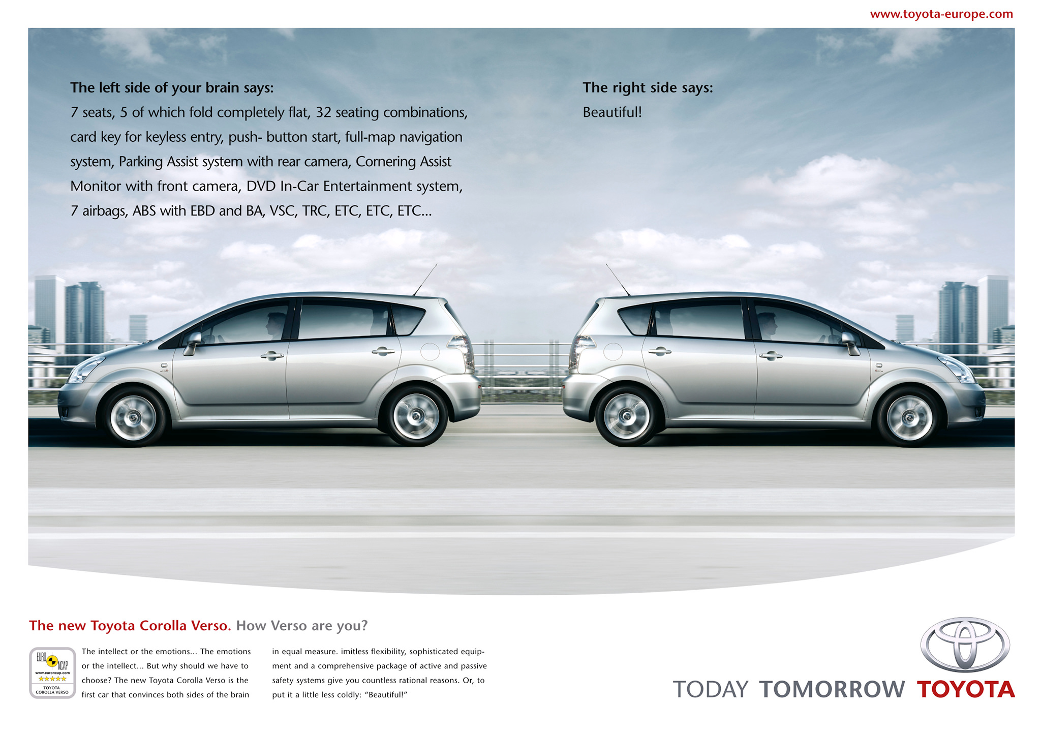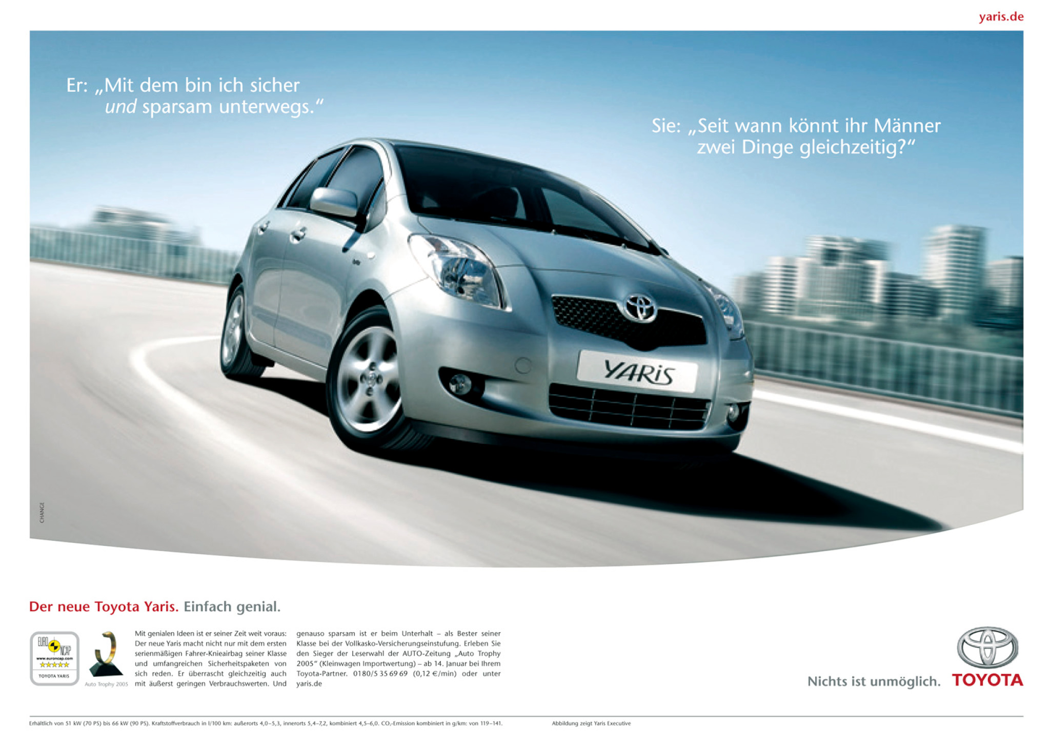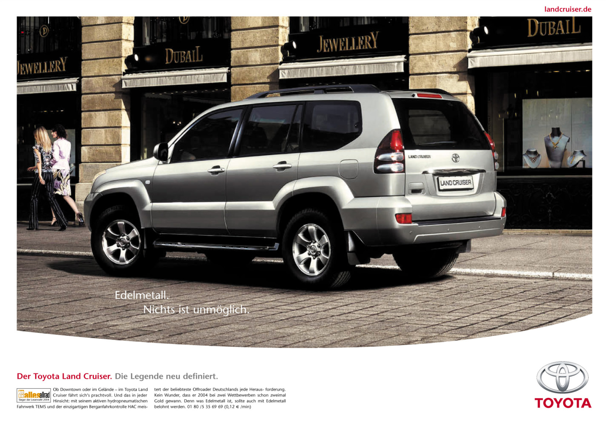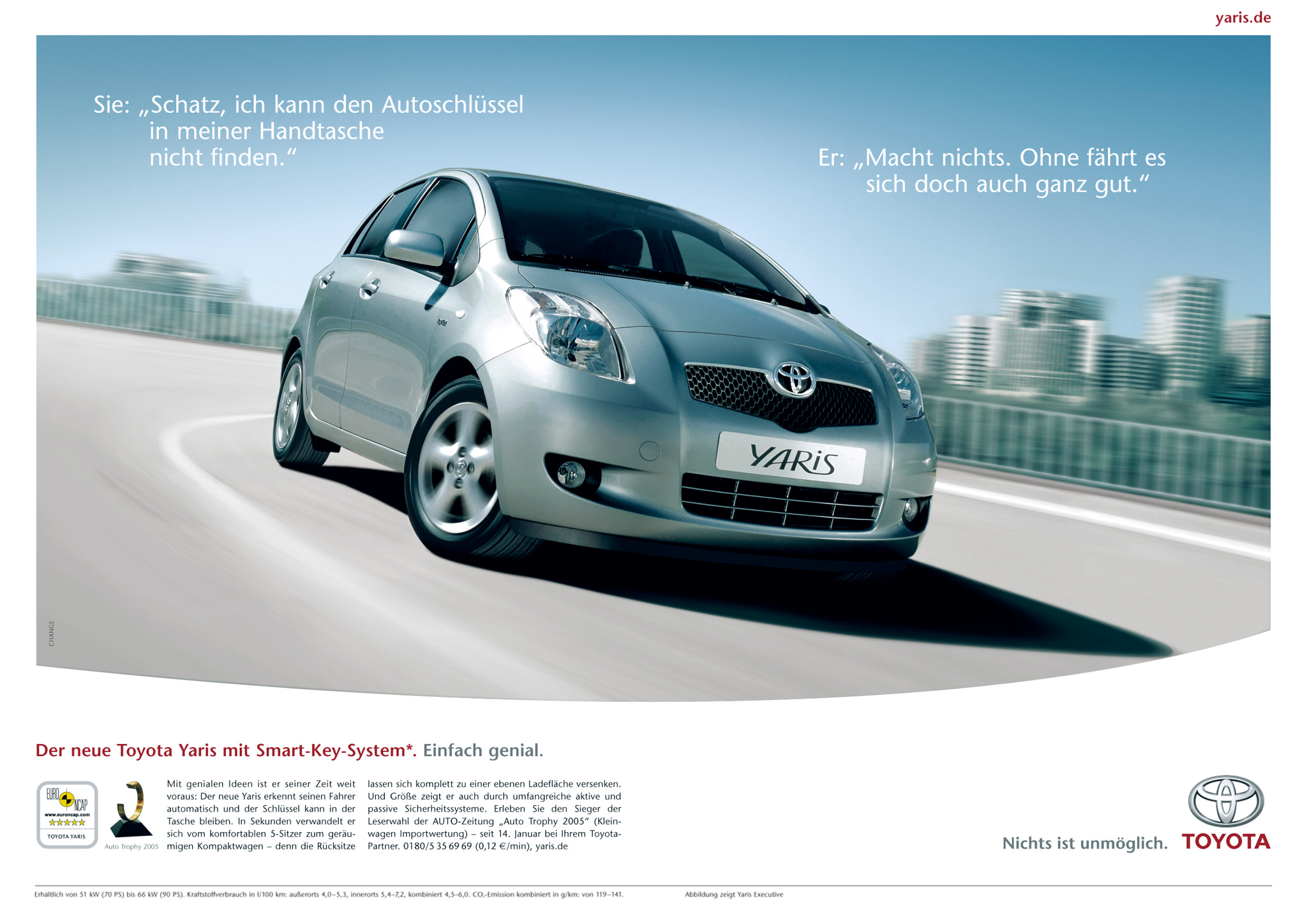 Eine Auswahl an Arbeiten für Toyota: Filmidee für Toyota Auris: „Stuntman“. Konzept, Art Direction und Shooting für Toyota Land Cruiser Kampagne. Art Direction und Shooting für Toyota Corolla Verso. Konzept, Art Direction, Shooting und Filmdreh für Toyota Yaris Kampagne „Dialog“. Konzept, Art Direction und Filmdreh für Premiere Trailer mit vier Toyota Car Lines. Art Direction, Shooting und Filmdreh für Yaris Testsieger-Kampagne. Konzept, Art Direction und Shooting Prius Kampagne. Art Direction und Shooting für Toyota Ersatzteile. Und das ist ja nur die Auswahl …